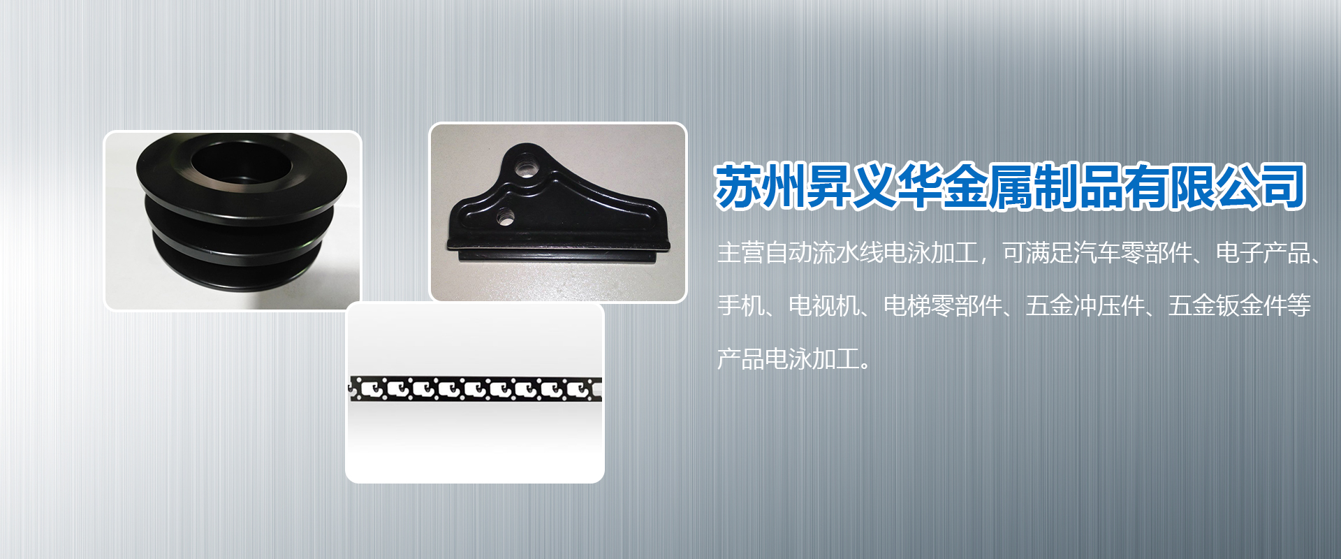 蘇州昇義華金屬制品有限公司是一家進(jìn)行各類(lèi)金屬表面處理專(zhuān)業(yè)公司。主營(yíng)自動(dòng)流水線電泳加工,可滿足汽車(chē)零部件、電子產(chǎn)品、手機(jī)、電視機(jī)、電梯零部件、五金沖壓件、五金鈑金件等產(chǎn)品電泳加工。